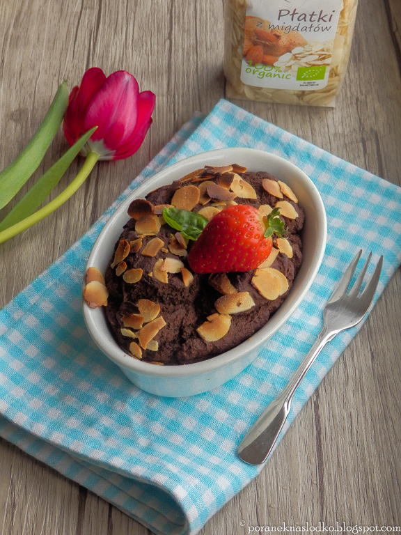 Czekoladowe ciasto z komosy ryżowej i groszku z ekologicznymi płatkami migdałów Symbio i truskawką