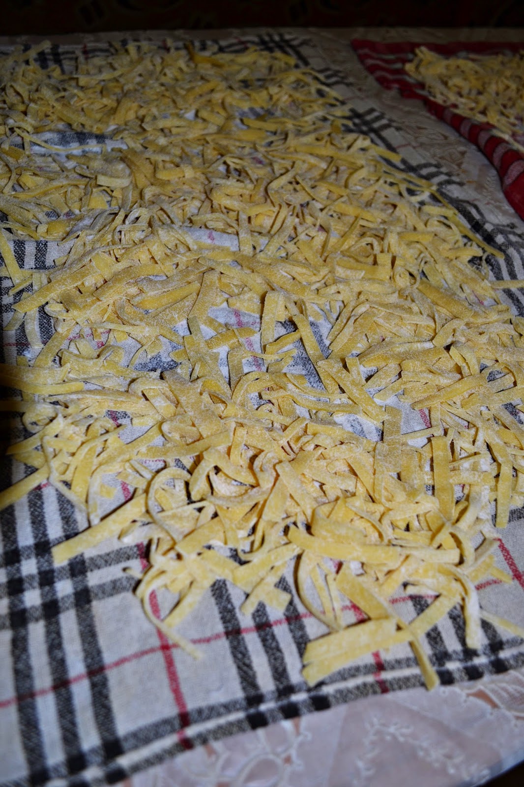 Mąkę przesiewamy. Dodajemy jajka i zagniatamy na gładkie ciasto.Z ciasto wałkujemy cieniutkie placki. Odstawiamy posypane mąką do wysuszenia na około 30 minut. Gdy placki będą już wysuszone kroimy na makaron ( w zależności jaki chcemy uzyskać). W moim przypadku kroiłam na paski, układałam