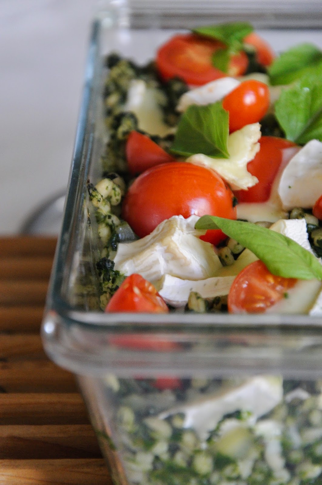 Kasza pęczak zapiekana ze szpinakiem, pomidorkami i camembertem