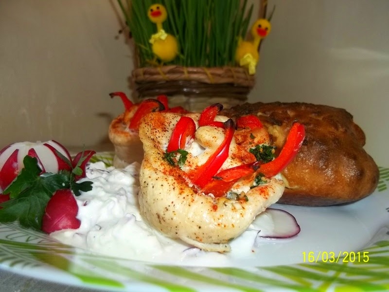-podwójny filet z piersi kurczaka-2 ząbki czosnku-5 dkg masła-1/2 czerwonej papryki-natka pietruszki-sól, pieprz, słodka papryka-olej