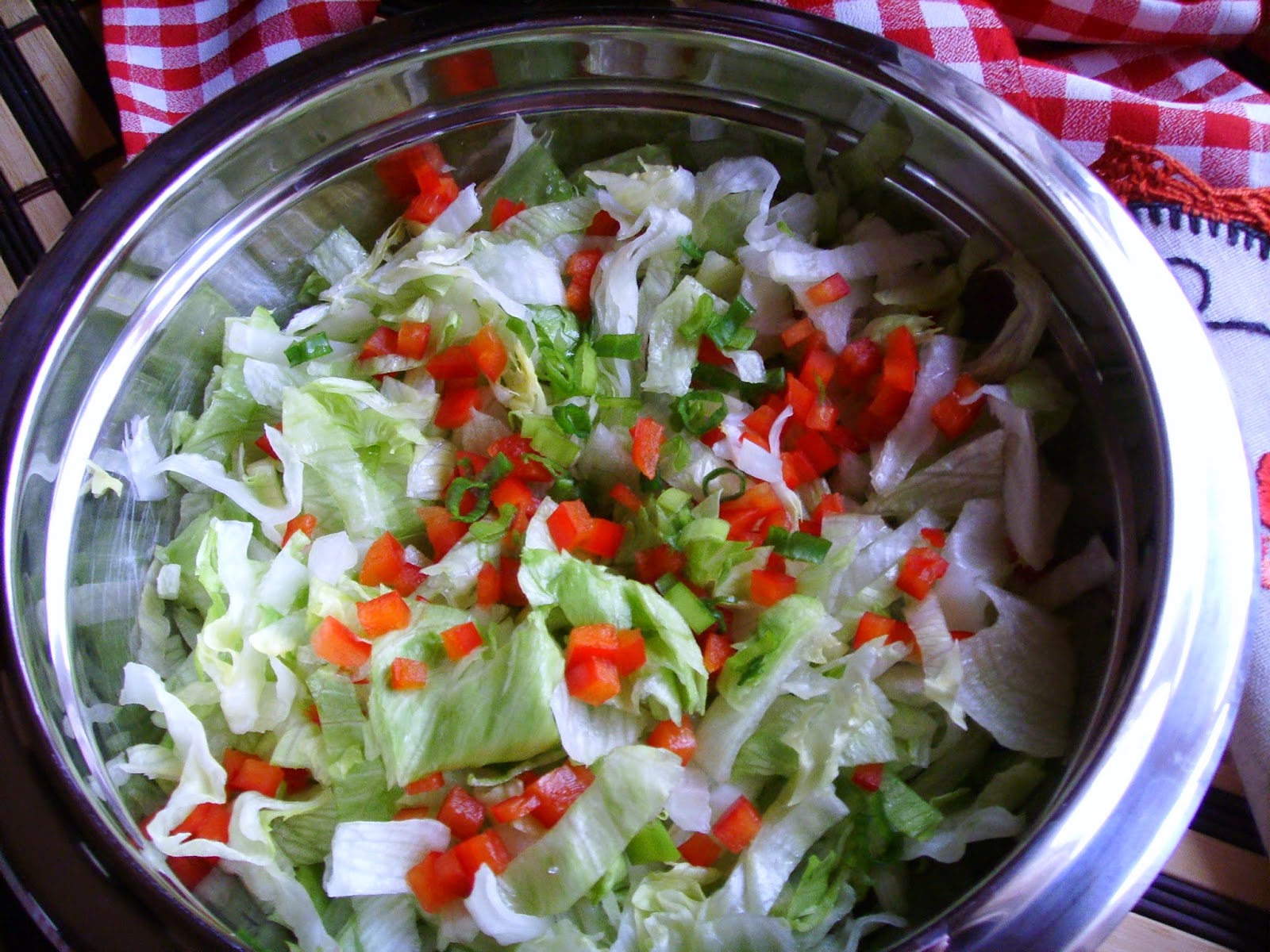 Smaczna i bardzo szybka sałatka… surówka obiadowa, czy grillowa. Sałata lodowa w delikatnym sosie czosnkowym na bazie oliwy z oliwek z dodatkiem papryki i zielonej cebulki dymki.. naprawdę smaczna, lekka i chrupiąca. Polecam 🙂