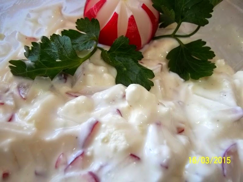 -20 dkg podsuszanego białego sera-kilka rzodkiewek-500 ml jogurtu naturalnego lub maślanki-3 ząbki czosnku-pieprz