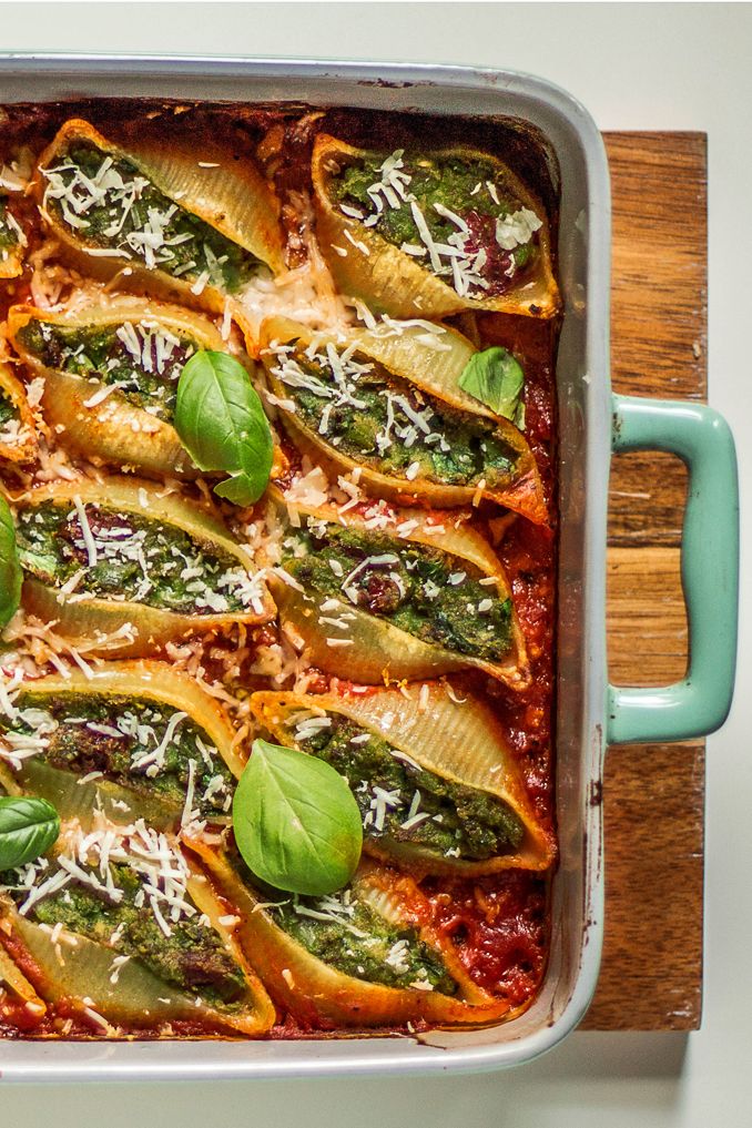 MUSZLE MAKARONOWE NADZIEWANE BOBEM I ZAPIEKANE W SOSIE Z POMIDORÓW