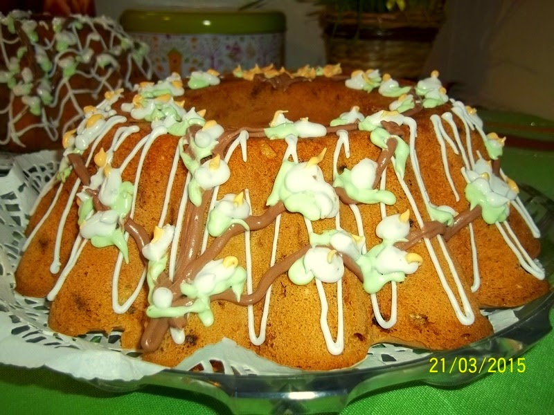 Puszysta babka z dużą ilością bakalii a zamiast orzeszkówprażona pszenica.