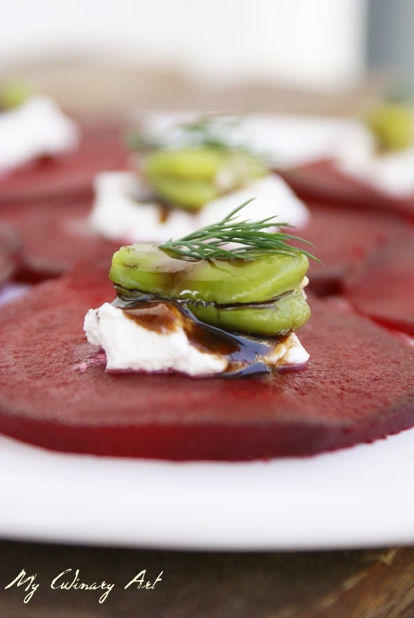 Składniki dla 2-3 osób:1 duży burak12 ziaren bobu100 g serka koziego3 łyżki octu balsamicznego3 łyżki cukrukoperek