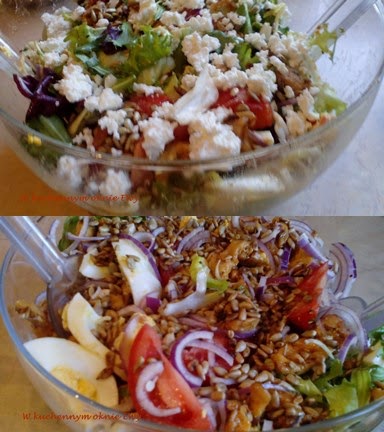Sałatka powstała bardzo spontanicznie. Potrzeba chwil. Kurczak karmelizowany z miodem i smaczny sos zrobiły swoje. Polecam.