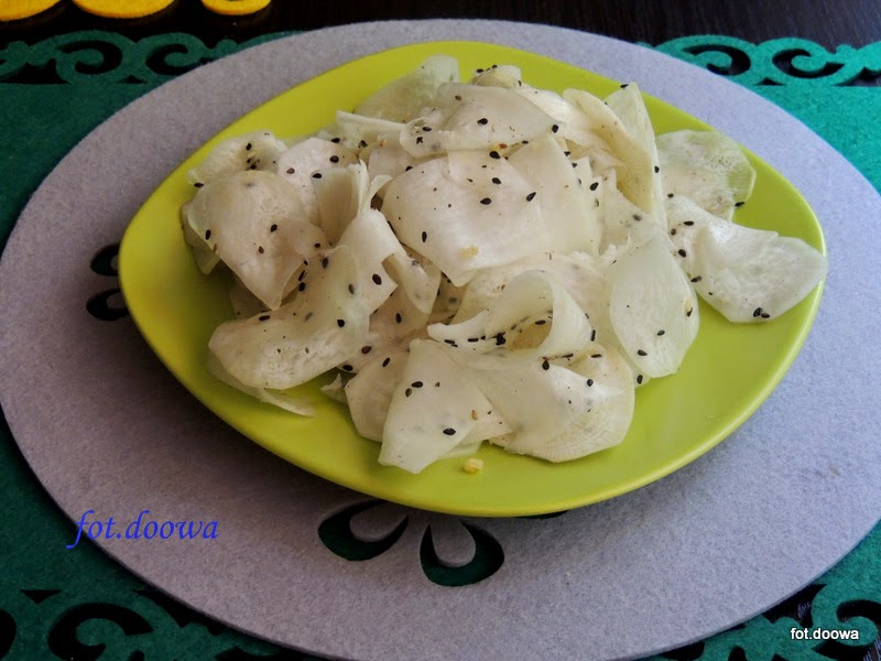Biała rzodkiew i czarna rzepa w czarnym sezamie.