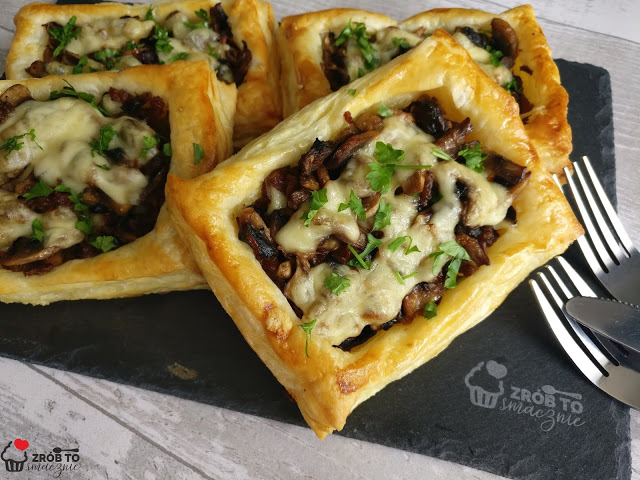 SZYBKA PRZEKĄSKA Z CIASTA FRANCUSKIEGO Z PIECZARKAMI I PRAŻONĄ CEBULKĄ