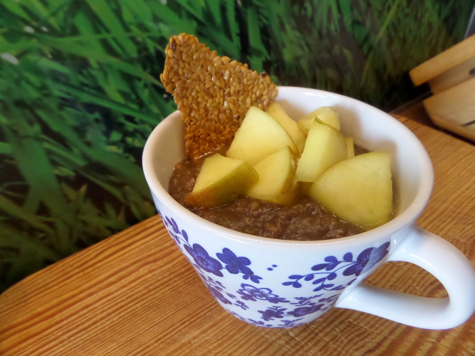 karobowo-cukiniowy krem owsiany z jabłkiem duszonym w syropie klonowym i raw chlebkiem z siemienia lnianego