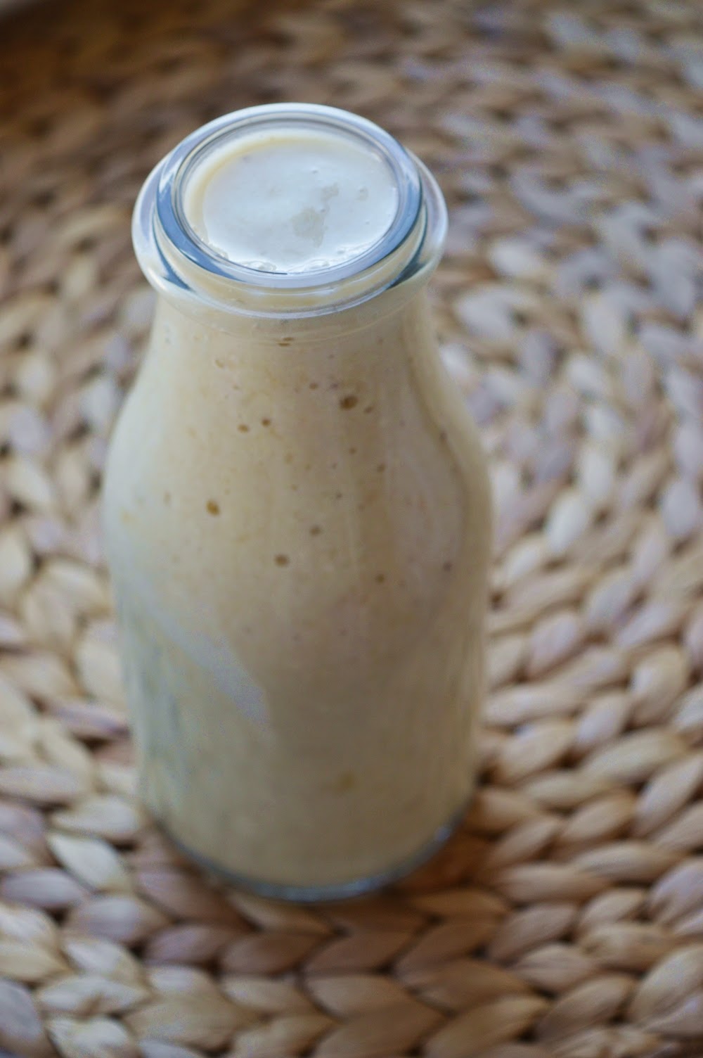 koktajl: płatki jaglane, banan, grejpfrut, syrop klonowy, mleko migdałowe