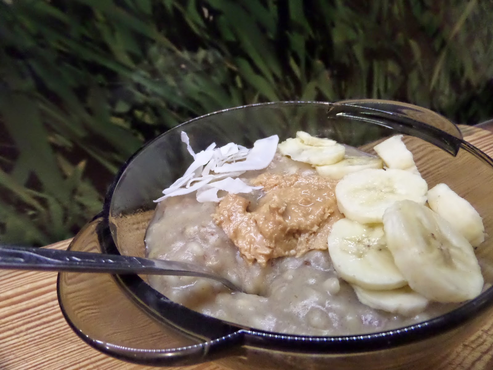 daktylowo-kokosowy-bananowy pęczak z bananem, masłem orzechowym i płatkami kokosowymi