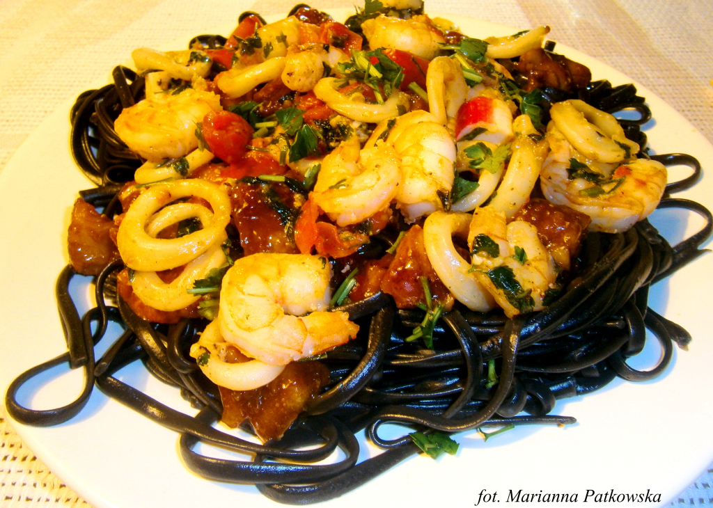 Czarny makaron fascynował mnie już od jakiegoś czasu, choć nigdy dotąd nie miałam okazji go spróbować. Postanowiłam to zmienić, robiąc lekką romantyczną kolację z jego udziałem. Wiadomo, że doskonale smakuje (i wygląda!) z rybami i owocami morza. No i tu właśnie pojawił się pewien problem. Owoce morza –