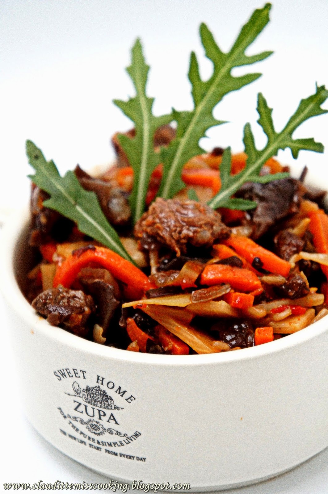 SKŁADNIKI:600-800 g wołowiny na gulasz1 opakowanie 450 g mrożonej mieszanki warzyw chińskich50…
