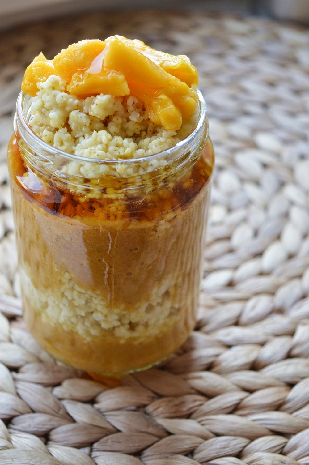 kokosowa* kasza jaglana z cynamonowym musem mango-banan, polana syropem klonowym*smażona na oleju kokosowym