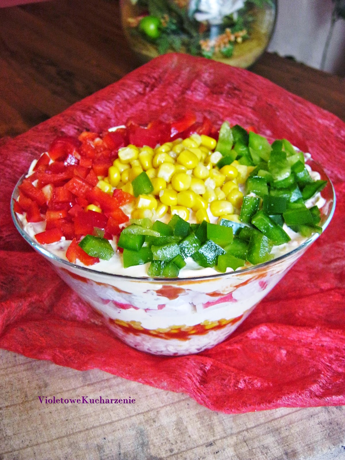 Prosta i szybka sałatka układana warstwami. Sprawdzi się na każdej domowej imprezie, do pracy czy szkoły. Po wyjęciu wszystko ładnie się łączy i smaki przenikają.