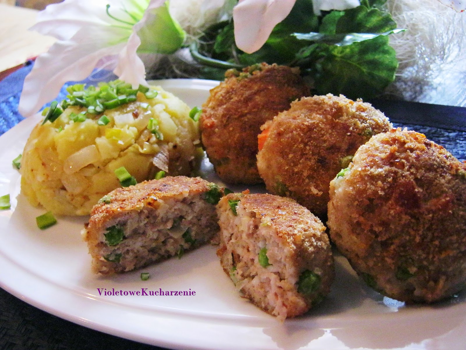Tradycyjne kotlety mielone w troszkę bogatszej wersji – z ryżem, marchewką i groszkiem. Dodatkowo daniu smaku nadają ziemniaczki z cebulką.
