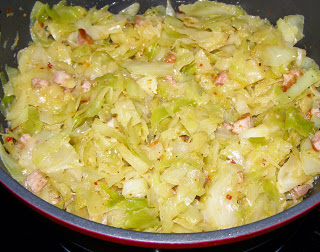 kapusta biała 1 główka, boczek parzony 20 dag, cebula 1 sztuka, olej rzepakowy 2 łyżki,