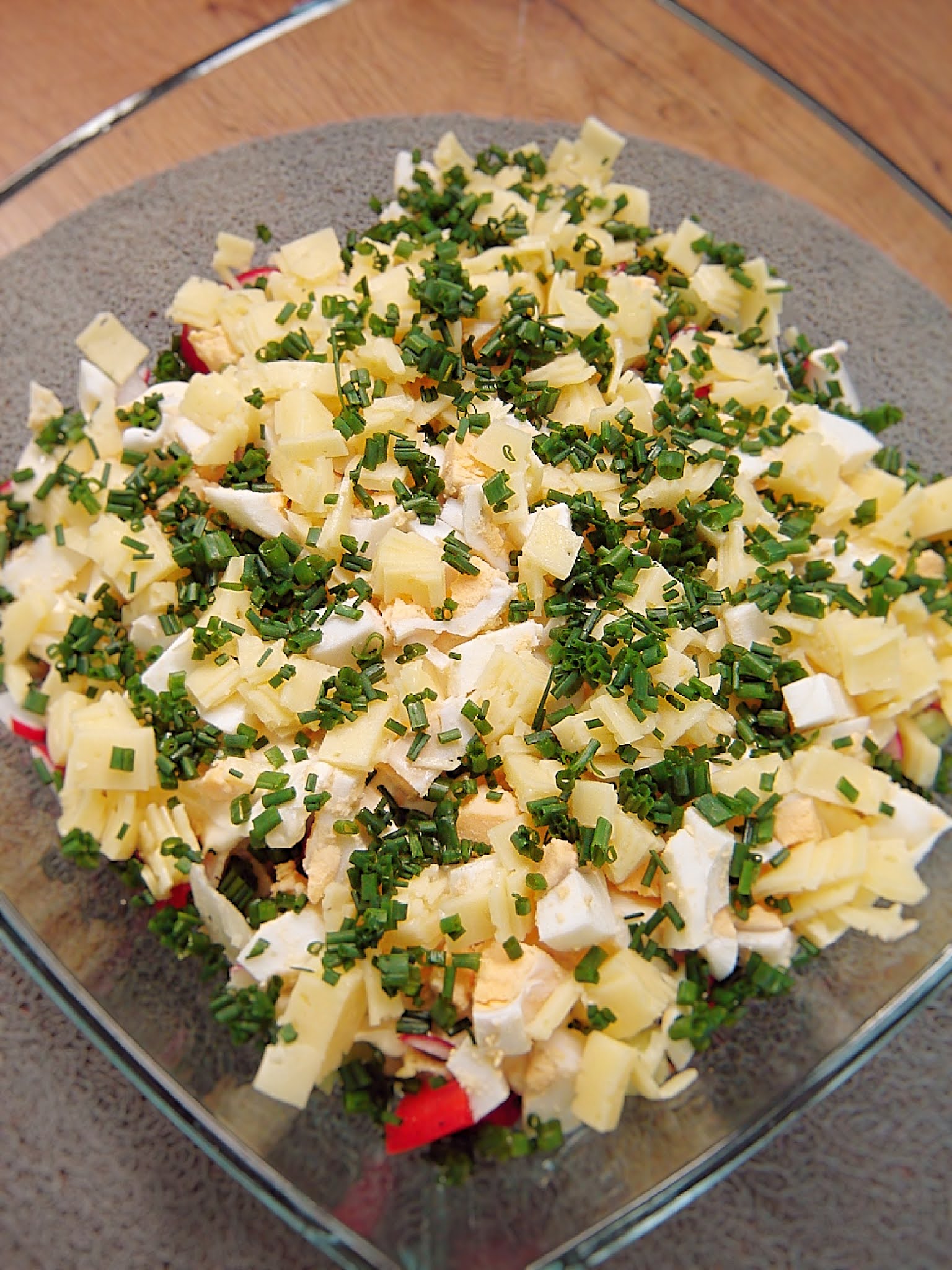 Sałatka warstwowa z jajkiem, papryką, ogórkiem, rzodkiewką i serem żółtym doskonale sprawdzi…