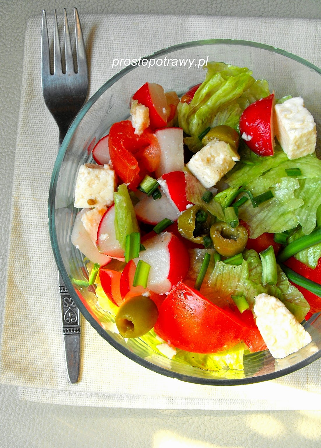 kilka liści sałaty lodowej2 pomidory7 dużych rzodkiewekkilka oliwekokoło