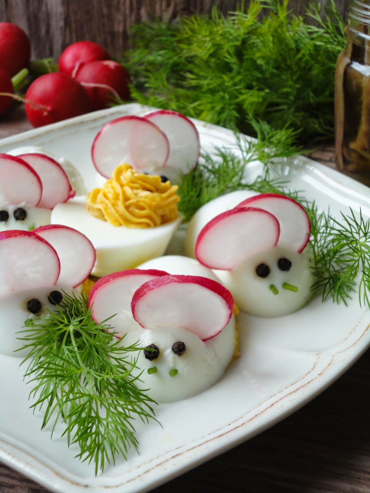 Z serii jajka-zwierzątka przedstawiam zabawne myszki, które dzięki ciekawej formie podanie będą miłą odmianą nie tylko na wielkanocnym stole. Farsz z sardelami jest wyrazisty i bardzo smaczny, z pewnością zasmakuje miłośnikom ryb.