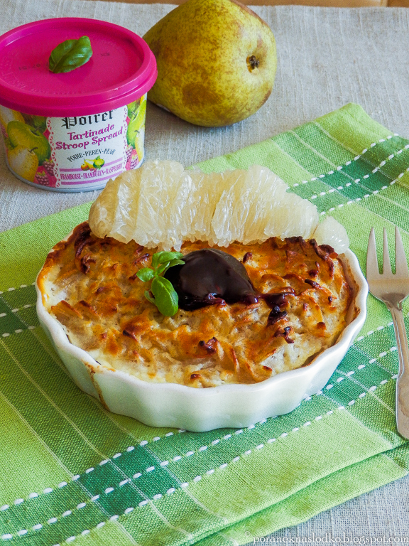 … czyli comfort food na niedzielne śniadanie. Czy wiecie, że to Mocno owocowa* zapiekanka twarogowa z makaronu orkiszowego podana z pomelo, i smarowidłem gruszkowo-malinowo-jabłkowym bez dodatku cukru* za sprawą sproszkowanego owocu baobabu 🙂