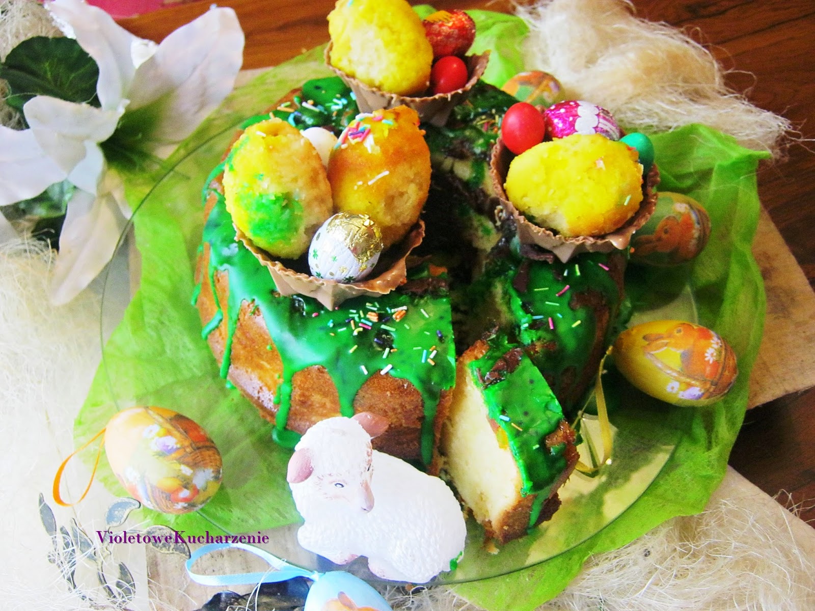 Babka wyrosła puszysta i delikatna z posmakiem ananasa… Ciekawym dodatkiem są jajeczka w koszyczkach z czekolady… Mogłyby być odrębnym dodatkiem, jednakże z babką komponują się idealnie…