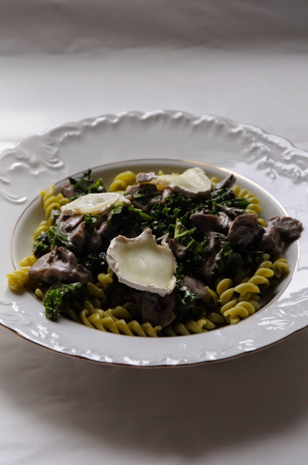 Makaron z sosem pieczarkowym z jarmużem i kozim serem