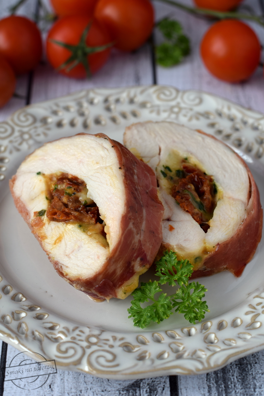 Podana w formie plasterków pierś kurczaka z nadzieniem z suszonych pomidorów, mozzarelli,…
