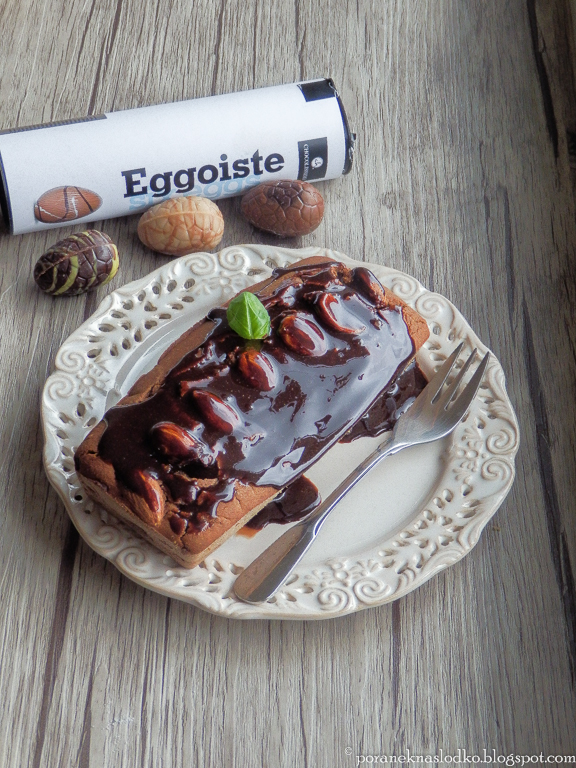 Bananowo*-czekoladowe brownie z migdałami i polewą kawową** podane z czekoladowymi pisankami…… bo Wielkanoc coraz bliżej! 🙂