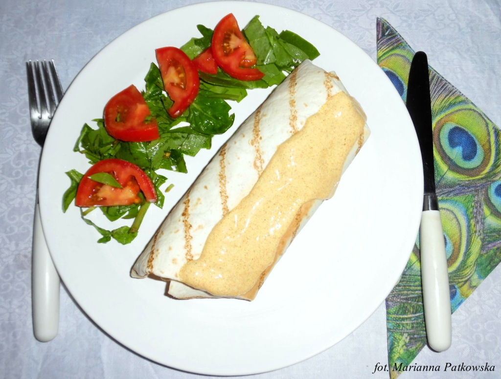 Burrito z batatami, kiełbasą i oscypkiem z dipem curry