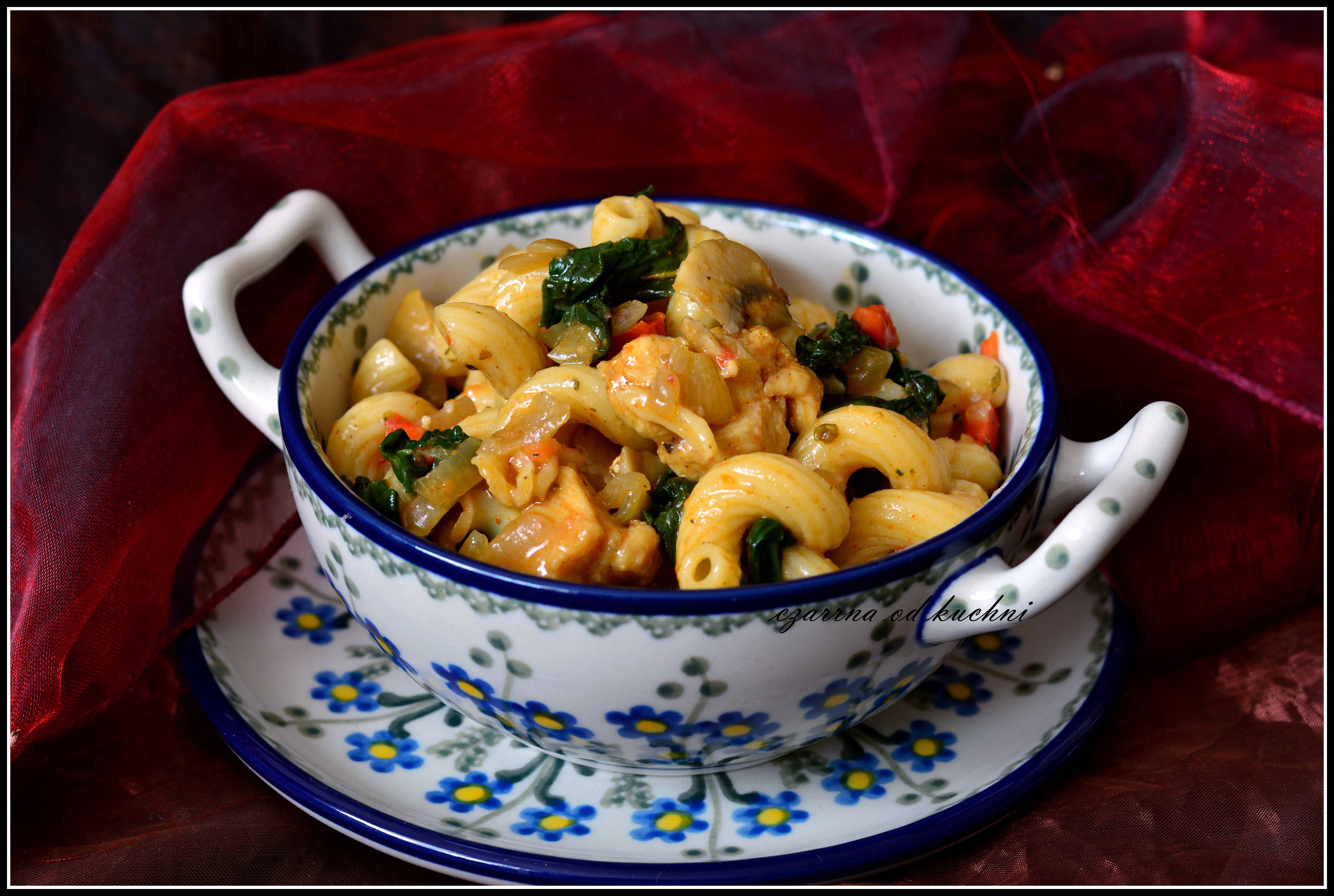 Składniki: 200 g ulubionego makaronu 1 filet z kurczaka 100 g szpinaku…