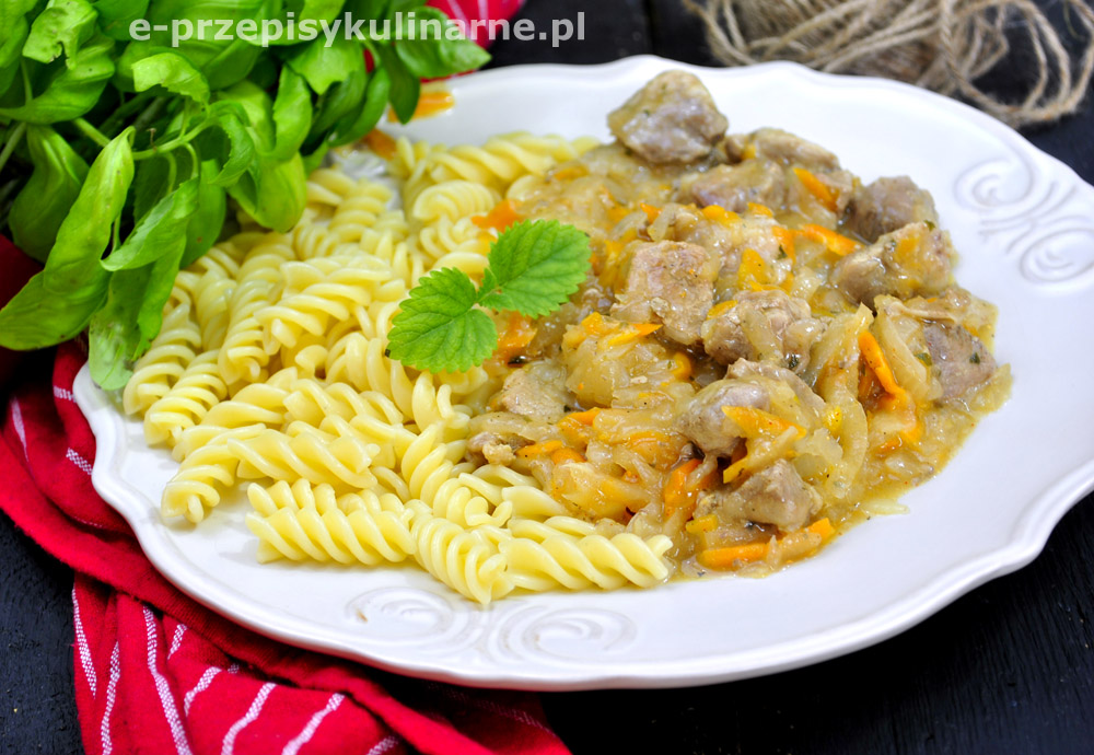 Wieprzowy gulasz z warzywami. Podajemy z makaronem, ziemniakami, ryżem lub pieczywem. Składniki:…