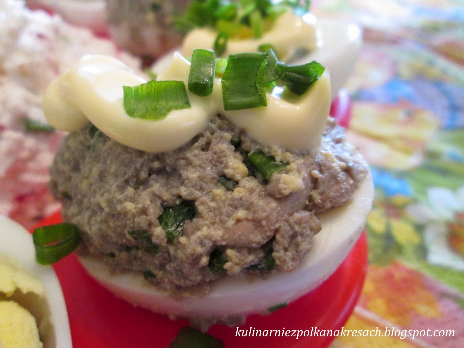 Przygotowanie:1. Ugotowane jajka obieramy ze skorupek, przekrajamy na pół i delikatnie wyjmujemy z nich żółtko tak by nie poszkodzic białka. Tak, zgadza się-mi w ferworze wielkanocnych przygotowań, jajka się troszkę przegotowały. W tym daniu jednak to nie będzie nam przeszkadzało.