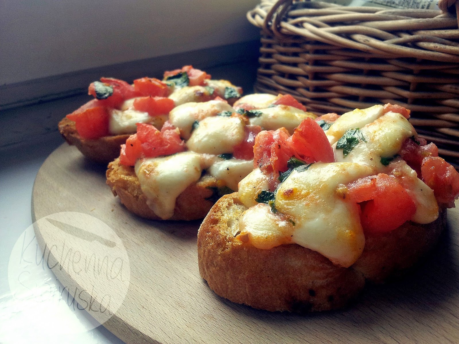 Składniki:- 4 kromki bułki lub bagietki- 1 kulka mozzarelli- 2 niewielkie obrane pomidory- 1 łyżka masła-