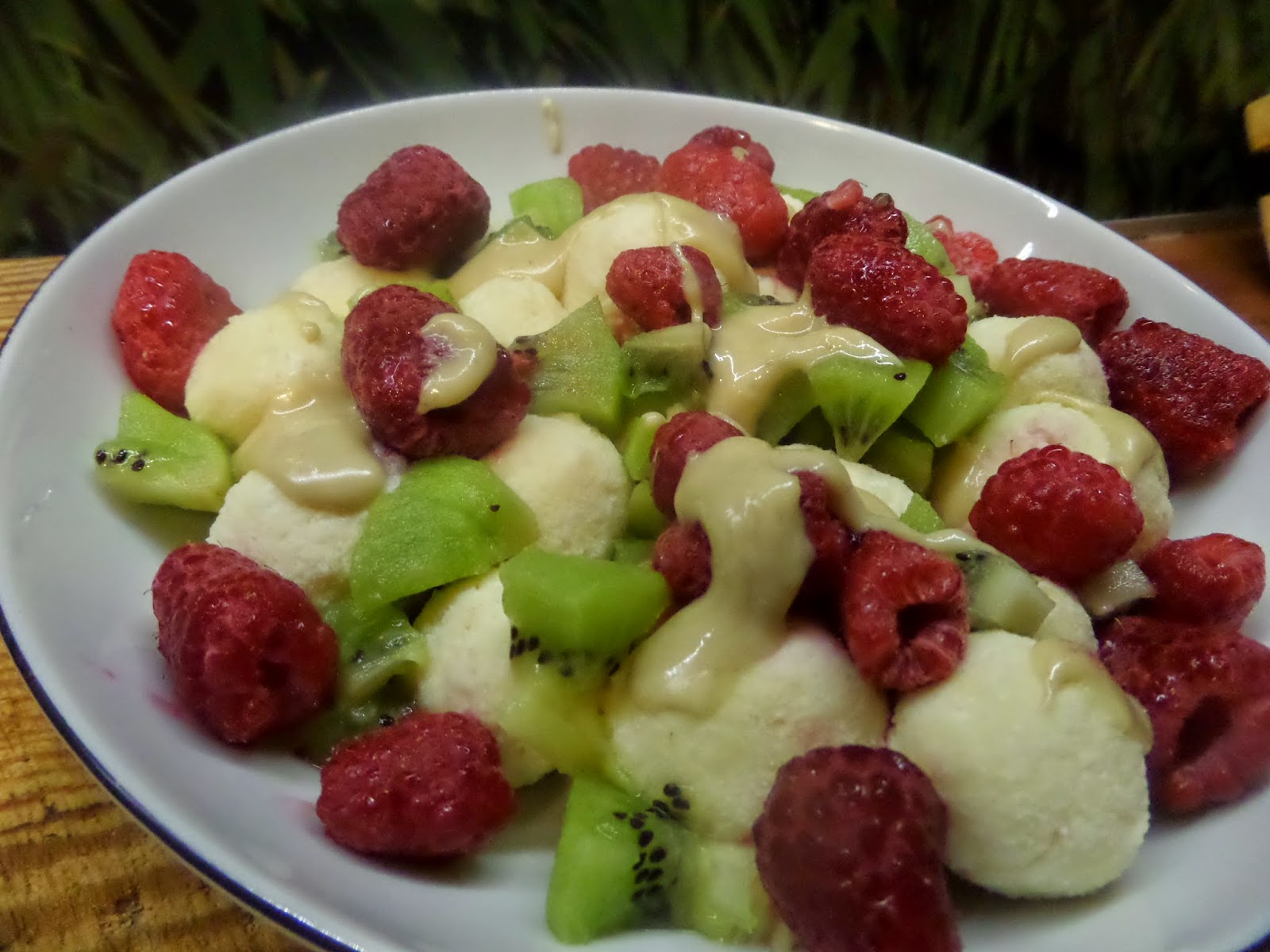 twarogowo-kokosowe kluseczki z kiwi, malinami i masłem z migdałów