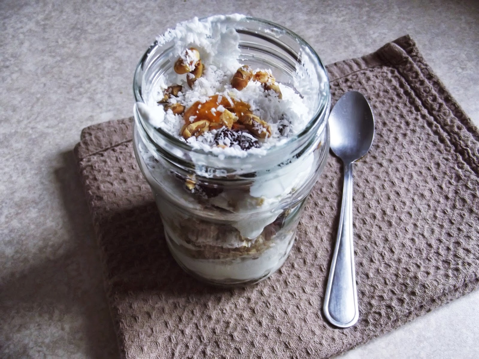 crunchy z dżemem dyniowym, suszoną żurawiną, orzeszkami sojowymi, nasionami słonecznika,wiórkami kokosowymi i przyprawą do szarlotkicrunchy with jam of pumpkin, dried cranberry, soy nuts, seeds of sunflower, desiccated coconut and spice for the apple pie