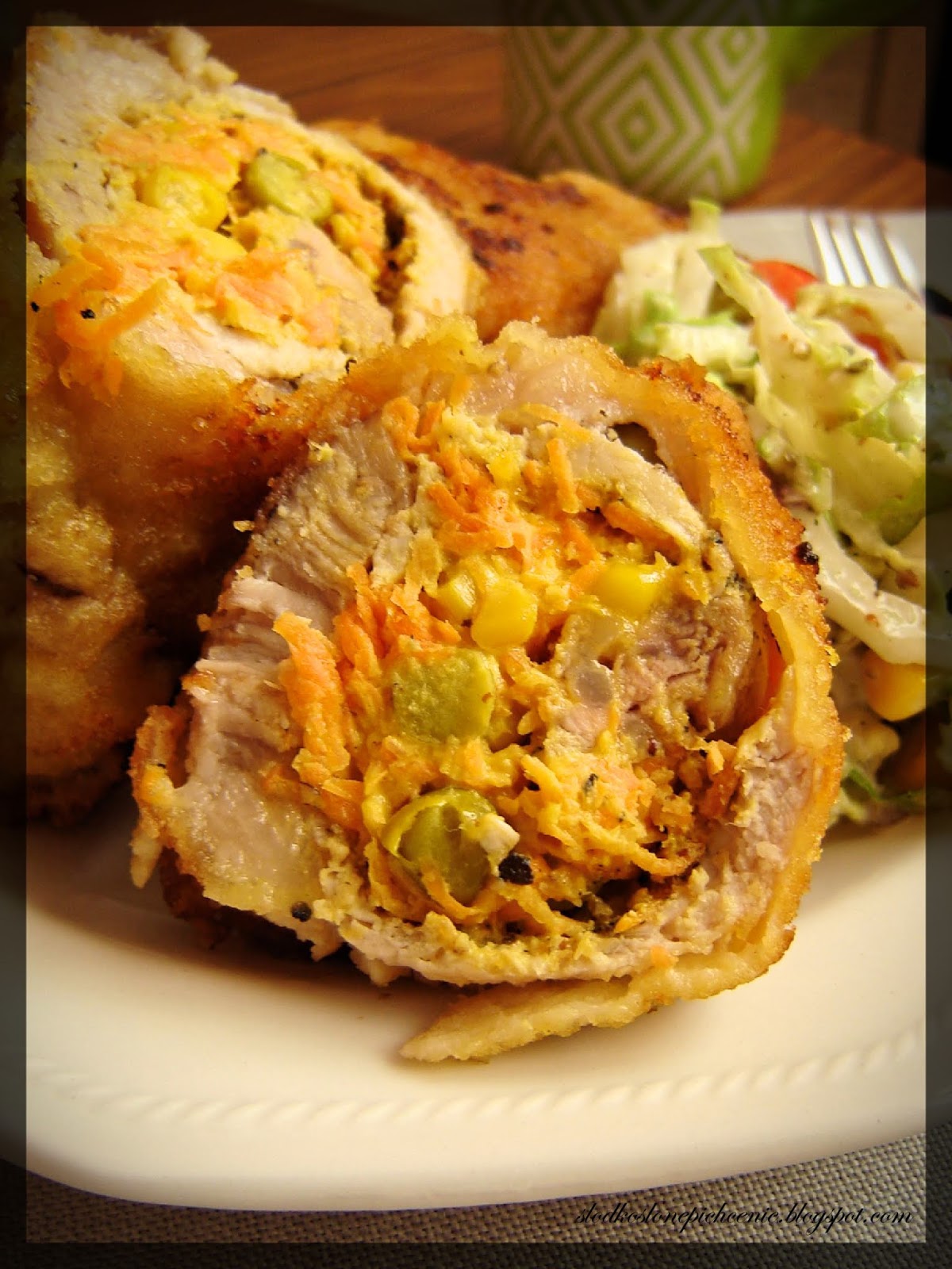Roladki schabowe z groszkiem, kukurydzą i marchewką