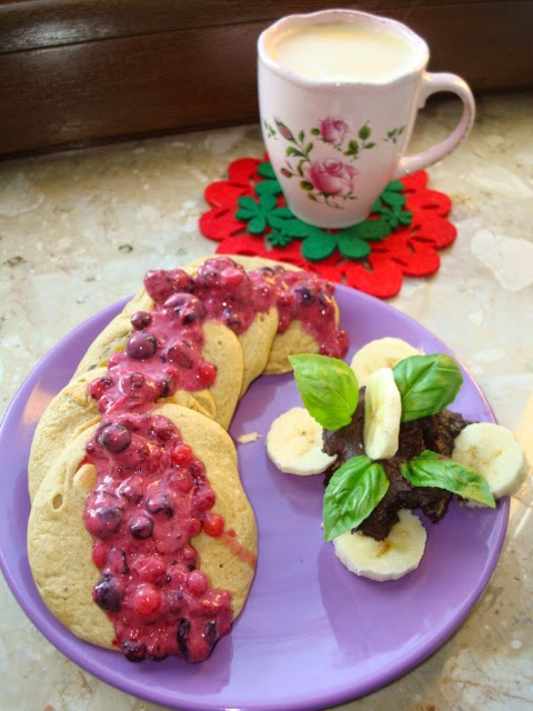 Placki zjedzone dziś w towarzystwie mamci ;p Były to owsiane placki z bananem. Podane z sosem z owoców leśnych (jeżyny, porzeczki, maliny, jagody) wymieszane z jogurtem, krem kakaowy z awokado. Mina mojej mamy kiedy spróbowała kwaśnego sosu….bezcenna 😀 hehe przecież to owoce leśne ;p Czego słodkiego się