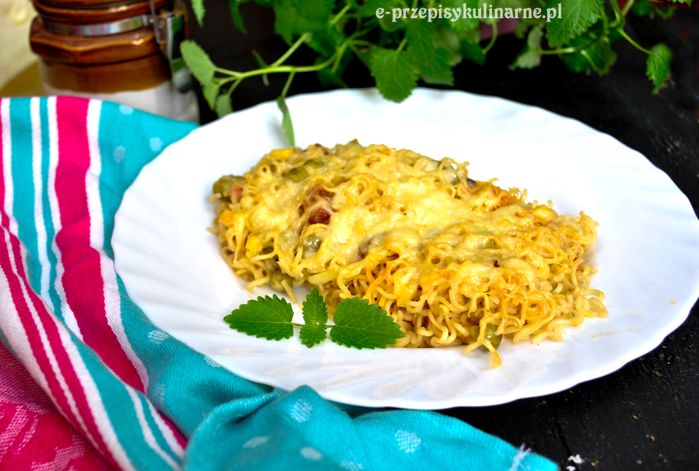 Kiedyś robiłam sałatkę z zupek chińskich, teraz przyszedł czas na zapiekankę. Zapewne niektórzy skrzywią się na samą myśl, że można jeść zupki chińskie, bo przecież takie niezdrowe, ale nic na to nie poradzę, że bardzo je lubię i raz na kilka miesięcy pozwalam sobie je przygotować. A taka zapiekanka jest