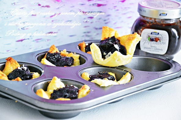 Koszyczki z ciasta francuskiego z serem pleśniowym i wiśniami i prażoną czekoladą…