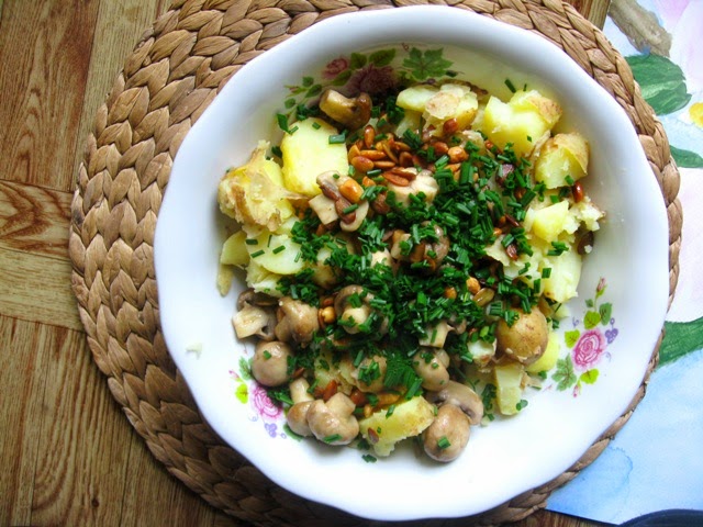Ziemniaki ugotować w osolonej wodzie, pokroić na duże kawałki. Pieczarki w całości wrzucić na rozgrzaną oliwę, dodać paprykę, sól i sos sojowy. Podsmażać