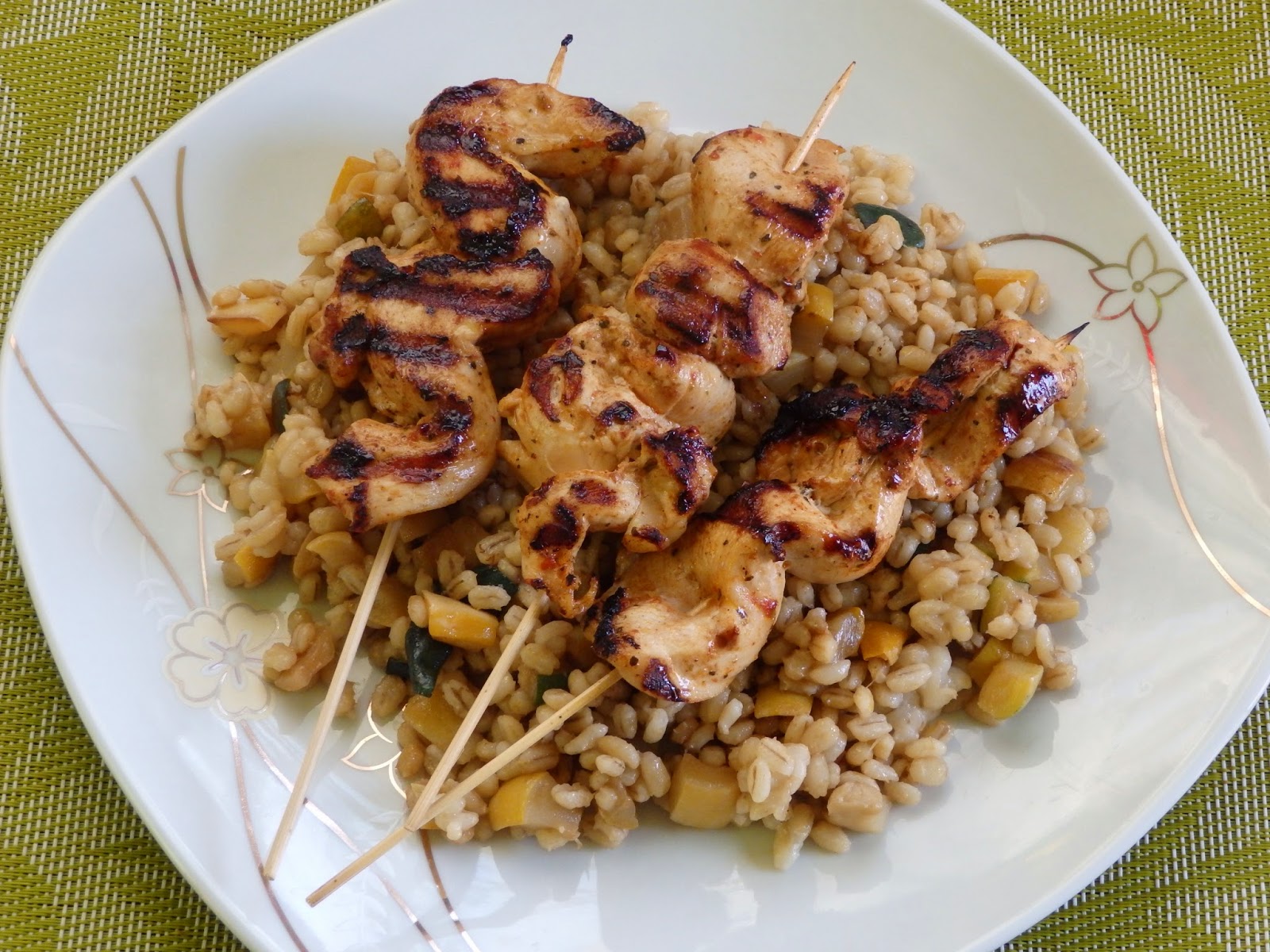 Pyszne drobiowe szaszłyczki z ostrą nutą. Szaszłyczki podałam ze smażonym pęczakiem z cukinią doprawionym sosem sojowym. Ja przygotowałam szaszłyczki na patelni grillowej ale można też na zwykłym grillu.