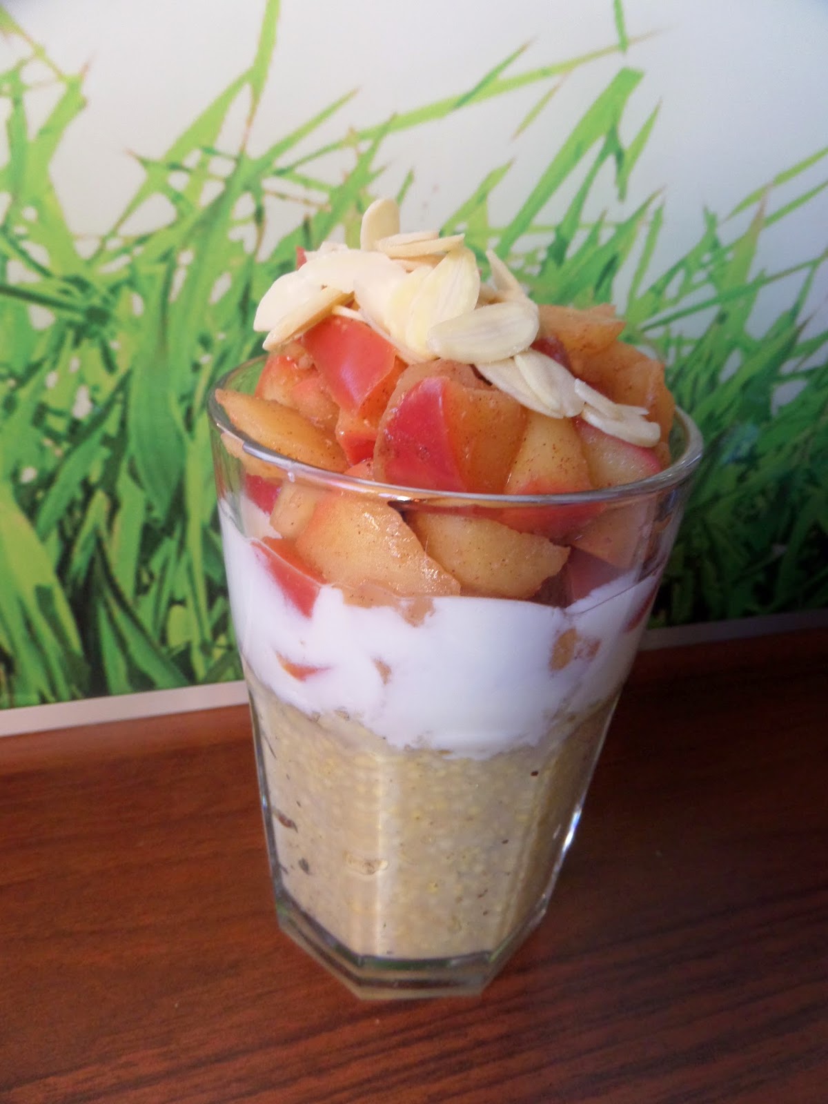 bananowa kasza jaglana z jogurtem naturalnym, jabłkiem duszonym w cynamonie i płatkami migdałówPrzepis:
