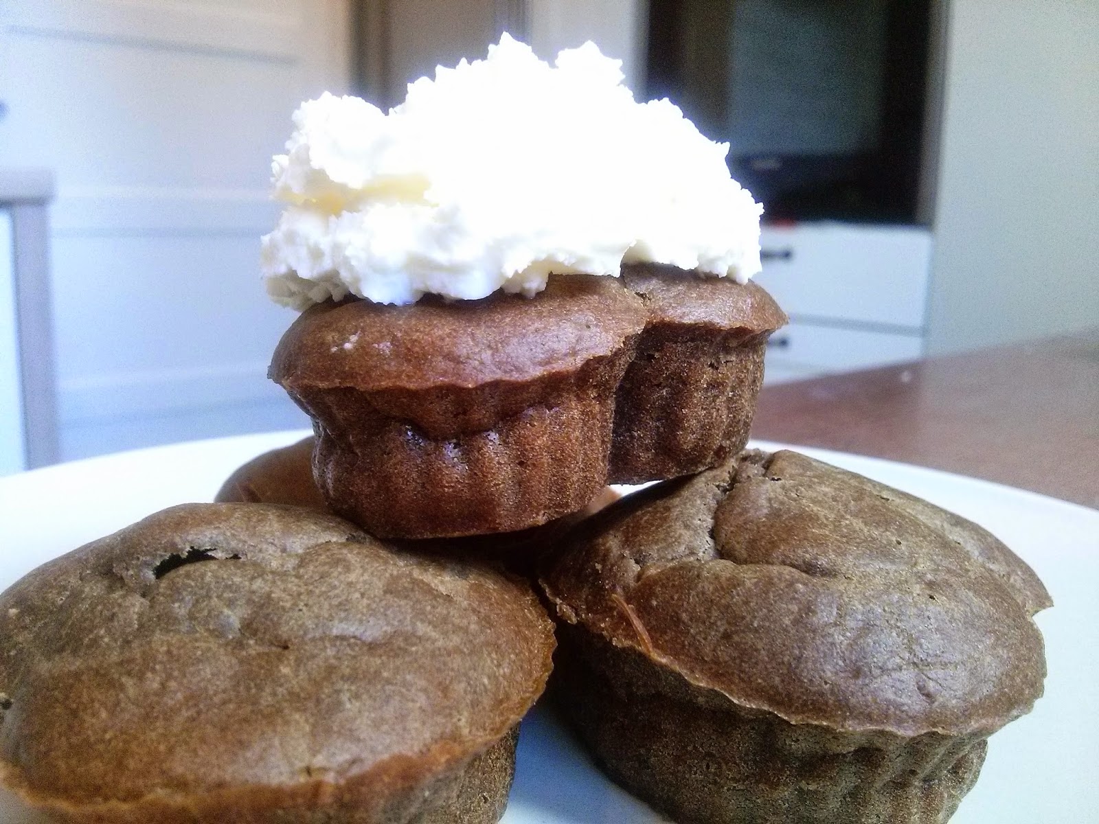Wczoraj naczytałam się przepisów na różne ciastka i babeczki, żadnego oczywiście nie zapamiętałam 😉 udało mi się jednak upiec babeczki, które spód i środek mają mięciutki a górę lekko przypieczoną. Są słodkie, kakaowe, lekko wilgotne, konsystencją dla mnie idealne 🙂 Izabellcia od razu zjadła całą, co u niej jeszcze jest