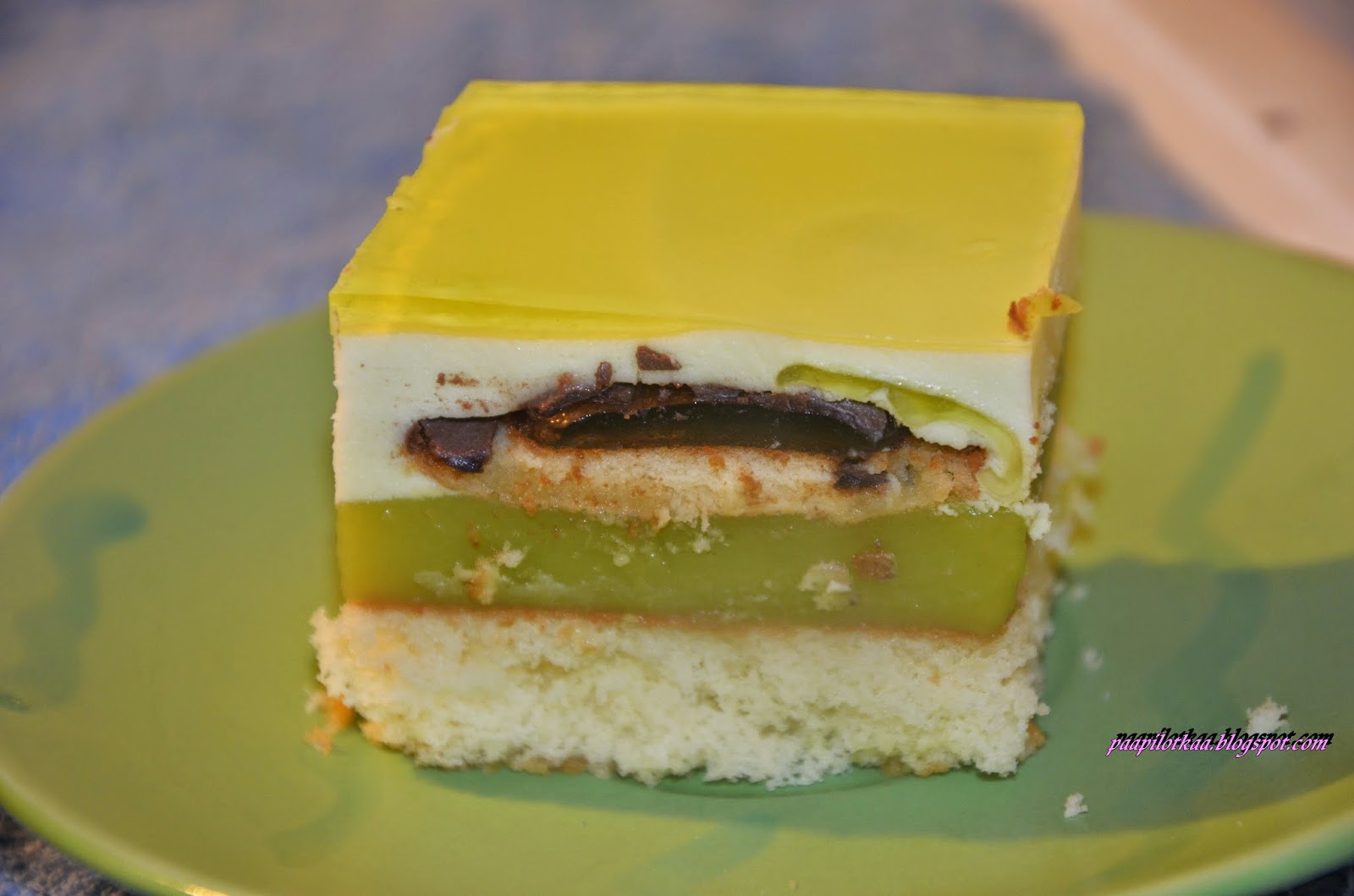 Składniki:Jasny biszkopt,900 ml zielonego soku,3 budynie waniliowe,660 ml śmietany kremówki,3 galaretki agrestowe,2 łyżki cukru pudru,2 opakowania delicji.