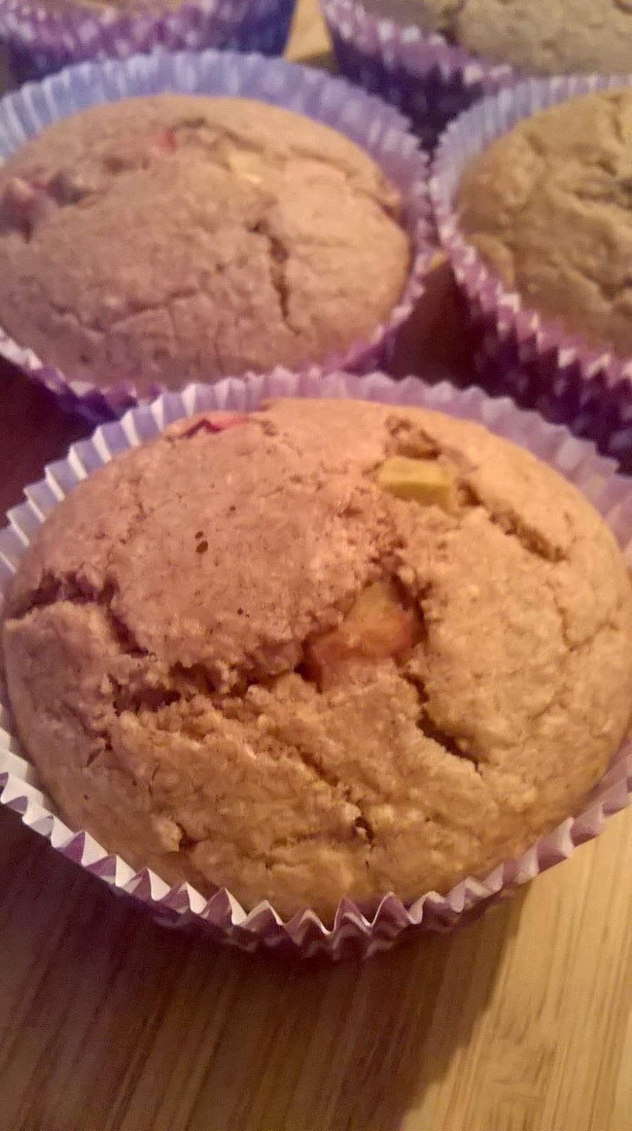 Pierwotnie miały powstać tradycyjne muffiny z rabarbarem tyle, że z mąki jaglanej. Miałam niestety za mało mąki więc musiałam eksperymentować. Dodałam zmielone płatki owsiane (w wersji bezglutenowej dodałabym jaglane, ale ich też zabrakło) i zamiast tradycyjnego oleju – kokosowy, ale też ograniczyłam jego ilość. Przez to babeczki są kruchutkie i
