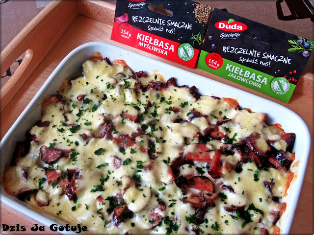 SKŁADNIKI: 600g ziemniaków150g kiełbasy jałowcowej firmy DUDA150g kiełbasy myśliwskiej firmy DUDA2 cebule…