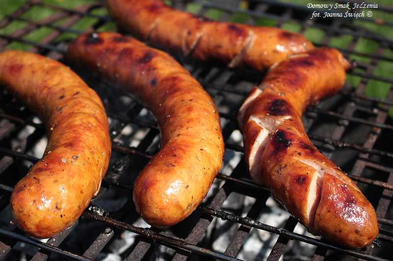 Wszystkie składniki marynaty mieszamy. Kiełbaski nacinamy, wkładamy do marynaty na ok. 10 min. Następnie układamy na grillu i