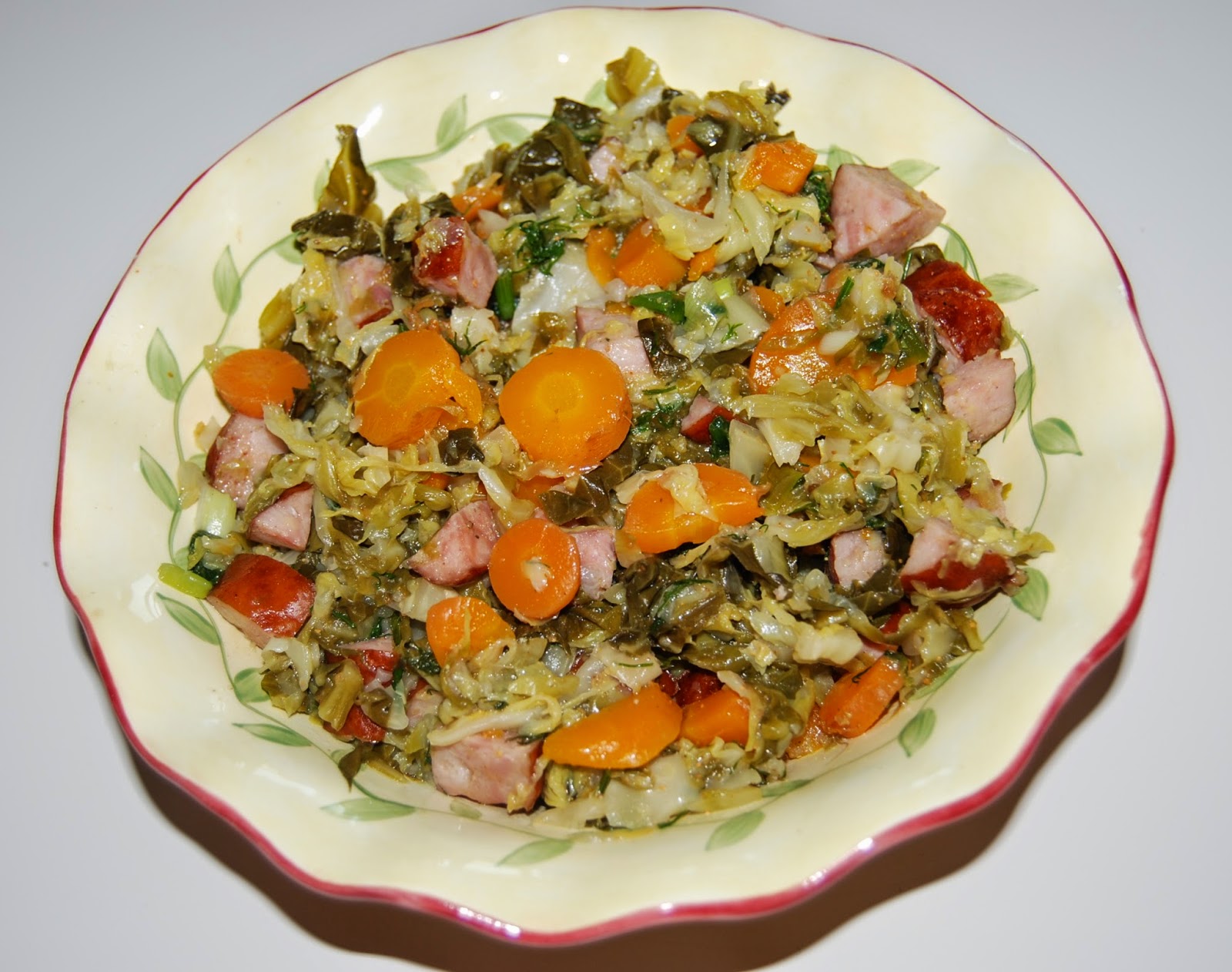 W rondlu roztopić masło i dodać kapustę, pokrojoną w plasterki marchewkę,cukier, sól, pieprz i dusić.