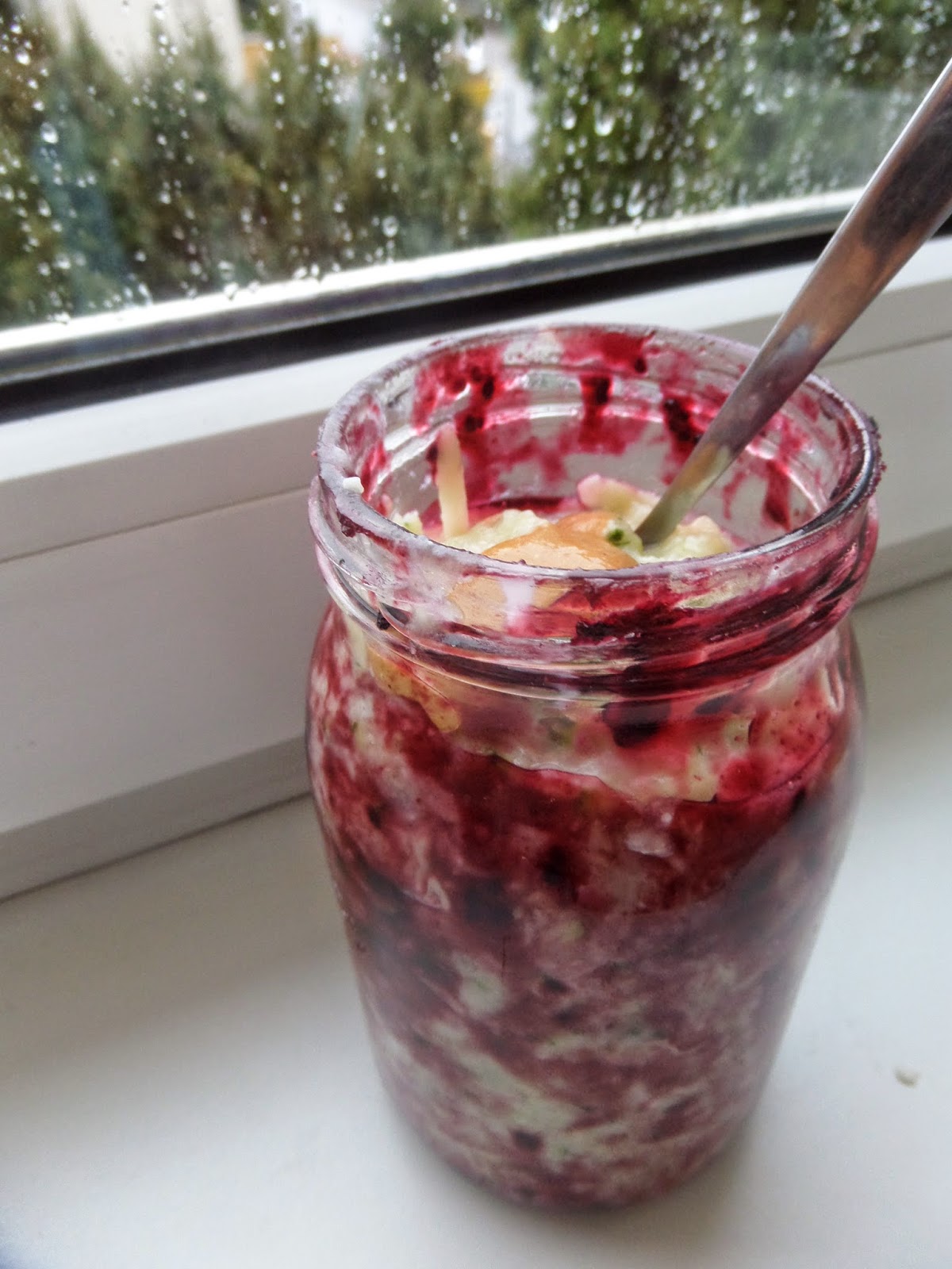 Do szkoły dopiero na 12.30 (zasługa maturzystów), ale nie będę leniuchować, tylko biorę się za robienie owaniliowo-cukiniowo-bnanowe płatki ryżowe w słoiczku po dżemie z czarnej porzeczki z domowym masłem orzechowym